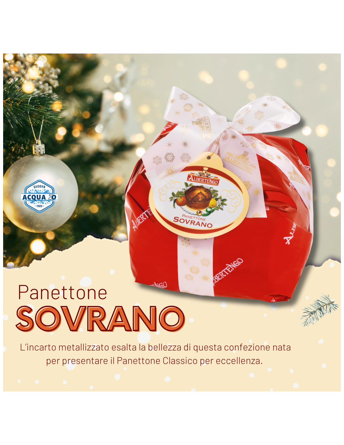 L’incarto metallizzato esalta la bellezza di questa confezione nata per presentare il Panettone Classico per eccellenza.