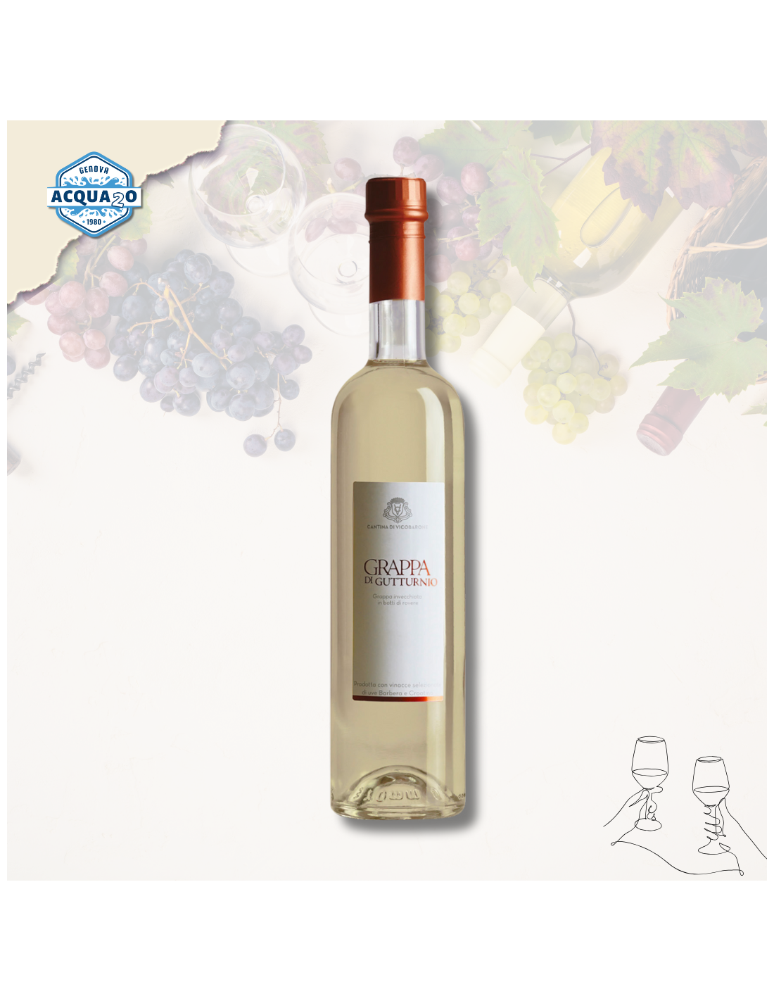 Prodotto con vinacce selezionate di uva Barbera e Croatina, della Cantina Vicobarone, distillate con il metodo tradizionale discontinuo a vapore in caldaiette. Successivamente la grappa viene invecchiata per 12 mesi in botti di rovere.
