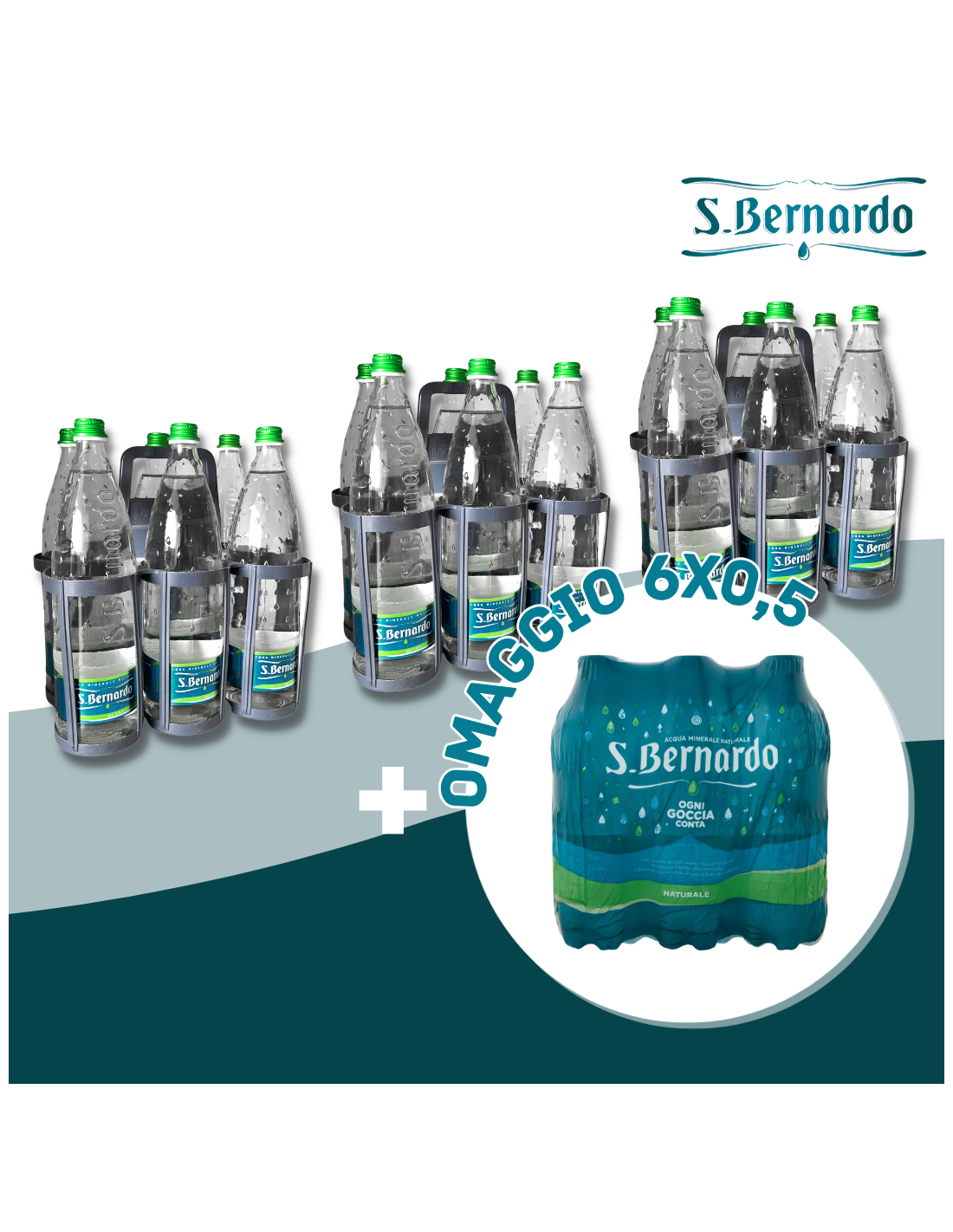 San Bernardo vetro, compri 3 cestelli (6x1l), in regalo una confezione da 6 bottiglie in plastica 0,5l naturale